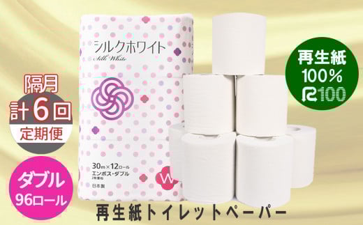 - 【隔月定期便・計6回配送】トイレットペーパー(30m)ダブル 96個「無香料」シルクホワイト エコ再生紙100% リサイクル 送料無料 大容量 日用品 まとめ買い 日用雑貨 紙 消耗品 生活必需品 物価高騰対策 防災 備蓄 生活雑貨 SDGs