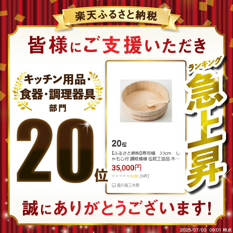- 【ふるさと納税】寿司桶 33cm しゃもじ付 讃岐桶樽 伝統 工芸品 贈り物 贈答 工芸 人気 おすすめ しゃもじ 米 杉 お寿司 ハレの日 ランキング 厳選 厳選杉 ごはん ギフト 桶 伝統工芸品 木工 寿司桶 木 香川県 三木町 送料無料