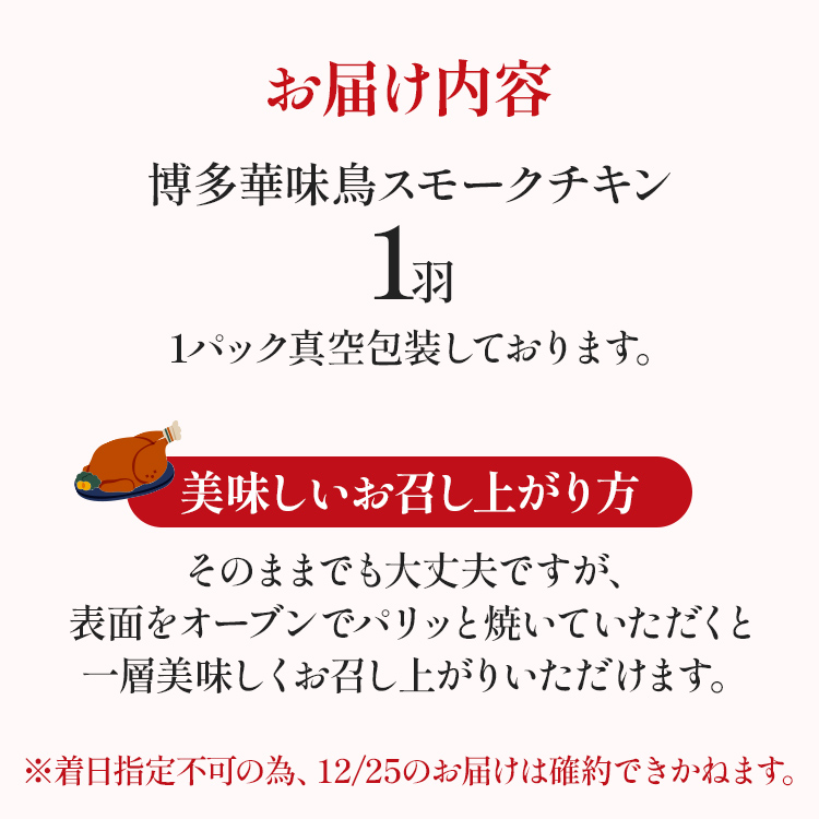 - 期間限定 予約商品 博多華味鳥スモークチキン 鶏肉 チキン スモークチキン クリスマス クリスマスチキン ホームパーティー 1羽 博多 華味鳥 お惣菜 ディナー ギフト 鳥 冷蔵配送 【着日指定,時間指定不可】