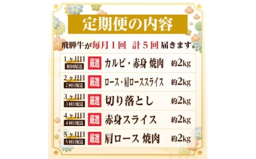 - <毎月定期便>飛騨牛 赤身・霜降り定期便 計10kg カルビ・赤身・ロース(焼肉・BBQ用)全5回【4075141】