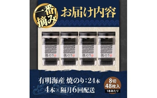 <隔月6回定期>有明海産・一番摘み海苔 焼きのり(総計24本・8切48枚×4本×6回) 福岡県産有明のり 海苔 有明海 初摘み 一番摘み 焼き海苔 常温 常温保存 定期便【ksg1836】【COLEZO】