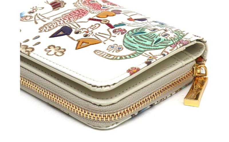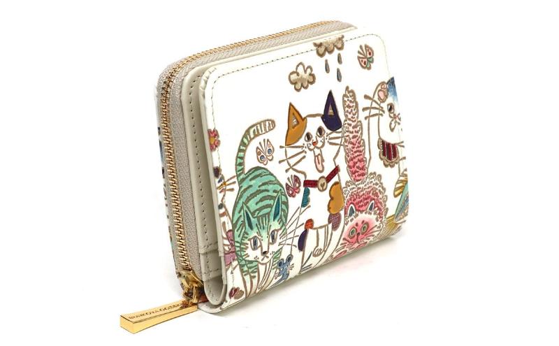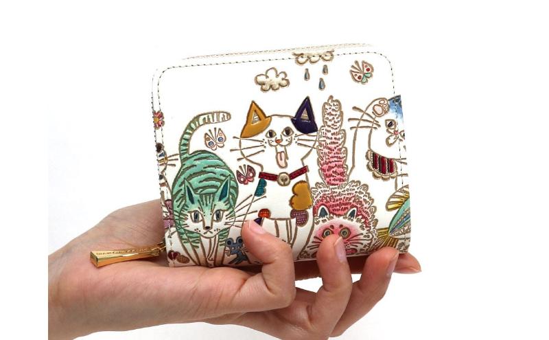 【文庫屋大関】二つ折りファスナーミニ財布 ネコ集合【皮革工芸品】財布 二つ折り 小物 お札 カード 小銭 コンパクト 牛革 手作り 日本製 墨田区 東京都
