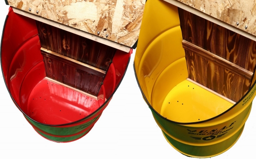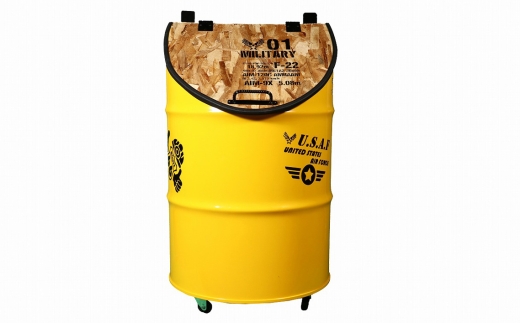 - No.347-02 【大容量屋外用】SDGsタテガタ トラッシュボックス YELLOW / ゴミ箱 大容量 屋外 SDGs トラッシュボックス 大型 大きいサイズ キャスター付き ドラム缶 おしゃれ インダストリアル リサイクル 木材使用 大阪府