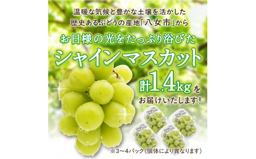 - 【先行受付】【2026年発送】九州福岡フルーツ王国八女 大粒入りシャインマスカット 約1.4kg【数量限定】<配送不可:北海道・沖縄・離島> 数量限定 高糖度 大粒 厳選 果物 くだもの フルーツ ぶどう 葡萄 ジューシー 種なし 冷蔵 九州 福岡県 八女市