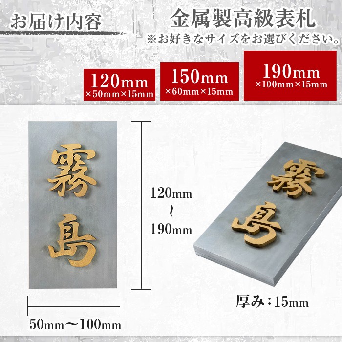 - <選べるサイズ>金属製高級表札(120mm・150mm・190mm)【キリシマ精工】霧島市 表札 ステンレス 高級 立体 戸建 屋外 オフィス 卓上 縦書き 横書き K-619 K-625 K-626