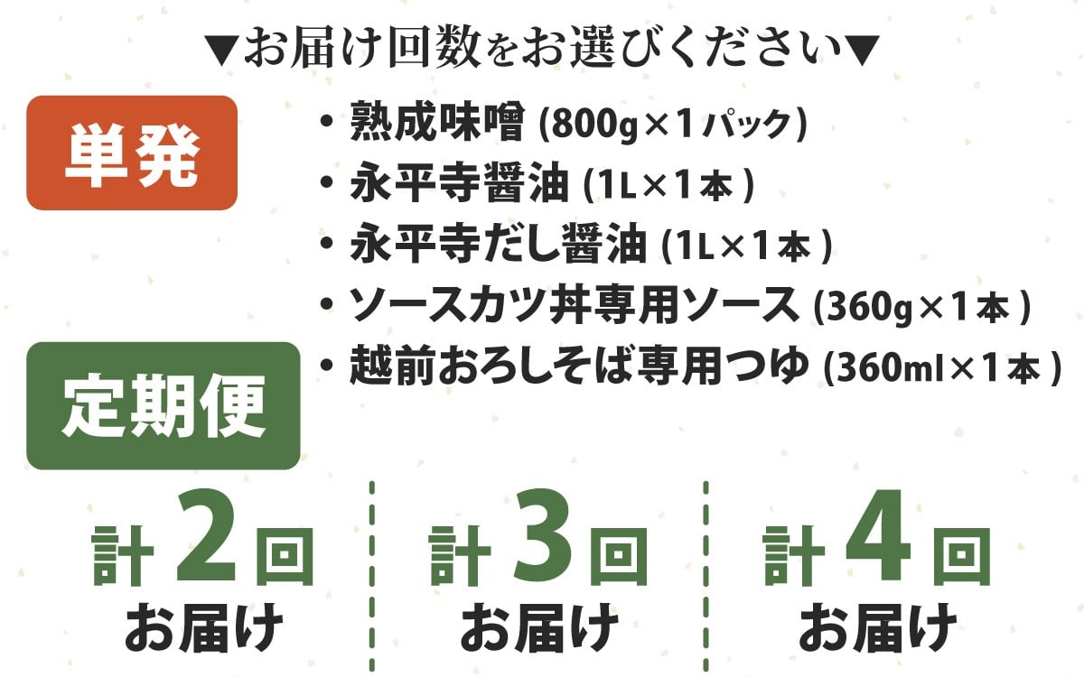 - 【選べる定期便1~4回】越前・永平寺調味料セット【1回単発便】【2~4回定期便】【お届け対象月 10月,1月,4月,7月】/ お味噌 醤油 だし醤油 ソース そばつゆ 頒布会 味噌汁 味噌 みそ 天然熟成 米みそ 米味噌 米糀 米麹 糀味噌 麹味噌 麹 おみそ 米麹味噌 米糀味噌 米麹みそ 米糀みそ 大豆