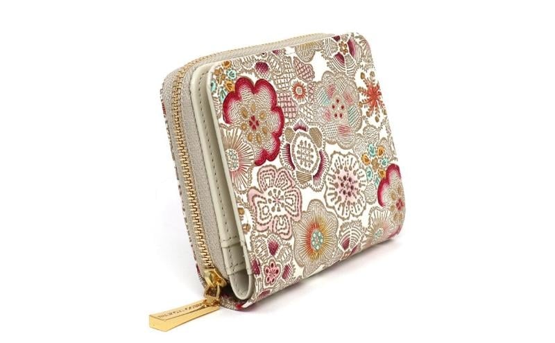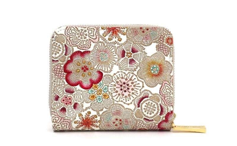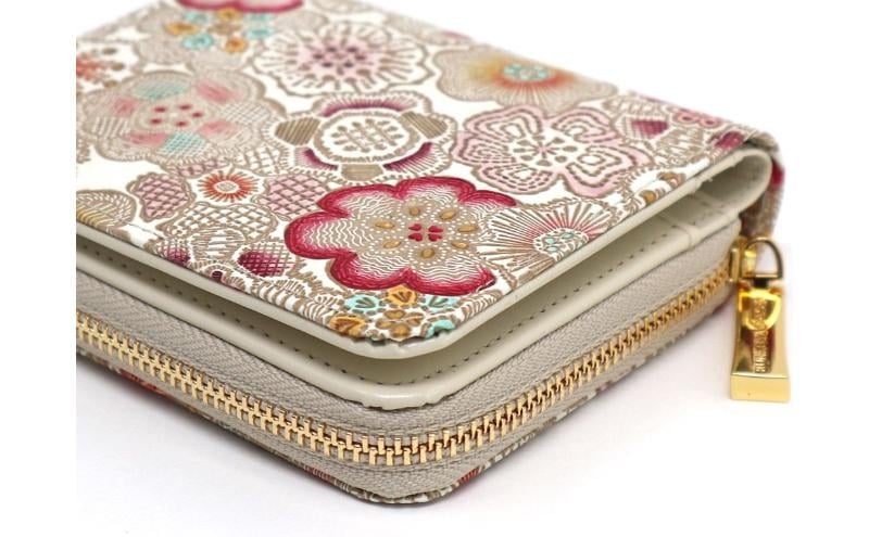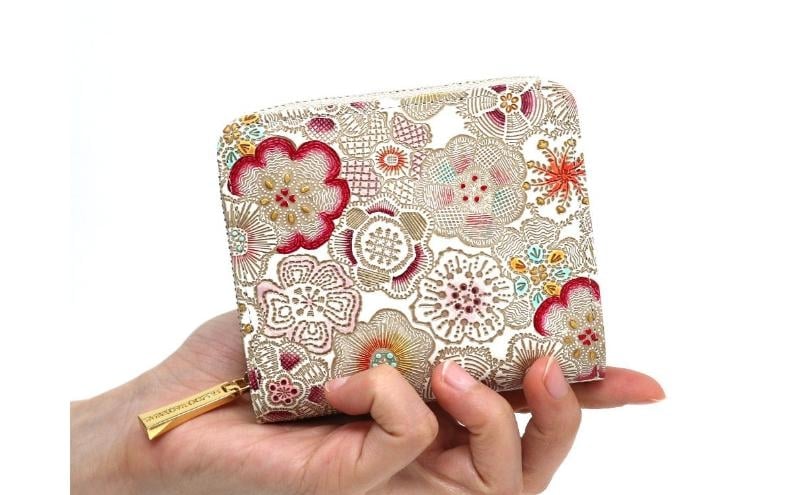 【文庫屋大関】二つ折りファスナーミニ財布 春らんまん<茜>【皮革工芸品】財布 二つ折り 小物 お札 カード 小銭 コンパクト 牛革 手作り 日本製 墨田区 東京都 [№5619-2034]