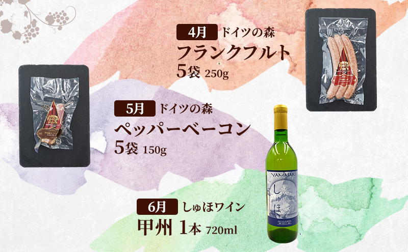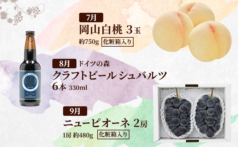 - 定期便 2026年 先行予約 是里ワイナリーの人気商品と岡山の人気果物 堪能 12回コース ドイツの森 ワイン ソーセージ ビール 桃 梨 赤磐市
