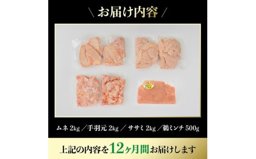 【12ヶ月定期便】宮崎県産若鶏 4種 6.5kg 【 国産 九州産 宮崎県産 鶏肉セット ムネ肉 ササミ 手羽元 ミンチ 鳥肉 とりにく 送料無料 川南町 】 [C06903t12]