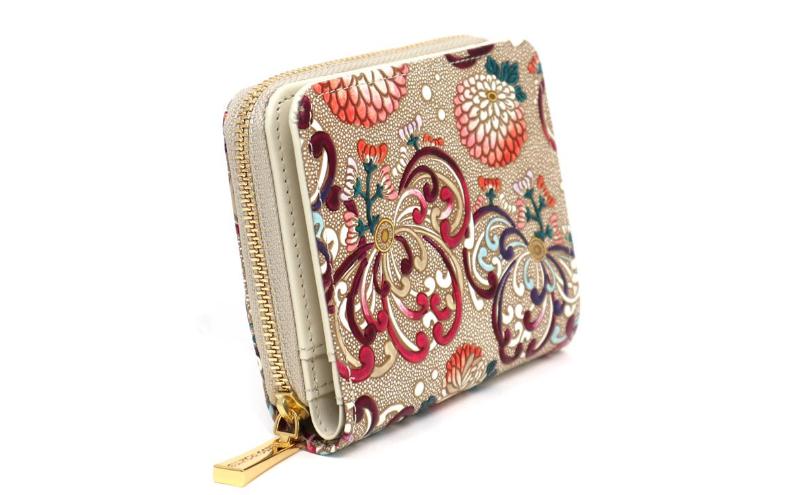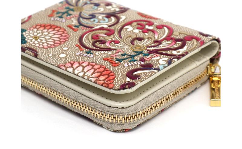 【文庫屋大関】二つ折りファスナーミニ財布 乱菊<赤紫>【皮革工芸品】財布 二つ折り 小物 お札 カード 小銭 コンパクト 牛革 手作り 日本製 墨田区 東京都
