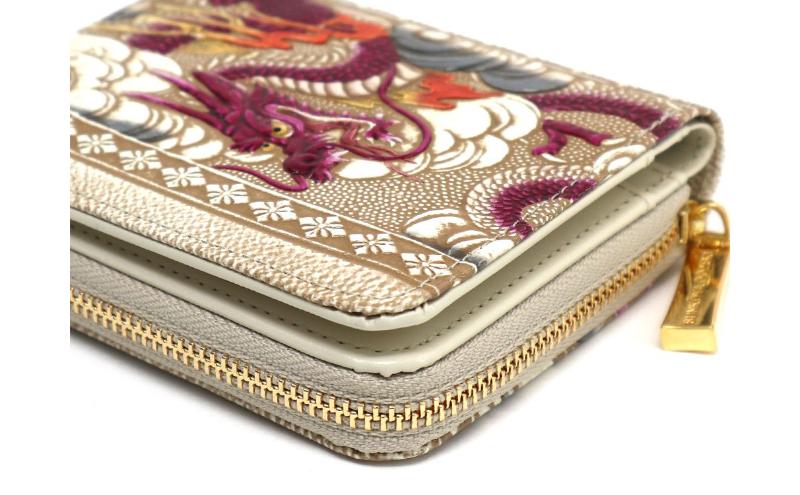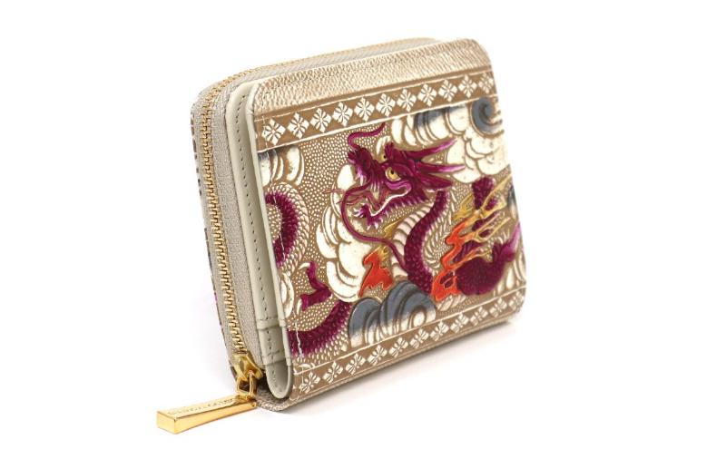 【文庫屋大関】二つ折りファスナーミニ財布 龍<ワイン>【皮革工芸品】財布 二つ折り 小物 お札 カード 小銭 コンパクト 牛革 手作り 日本製 墨田区 東京都