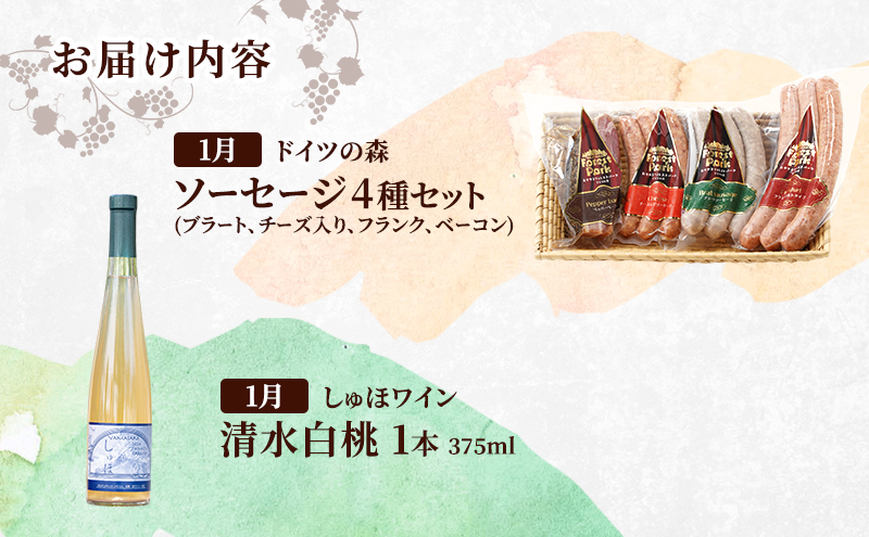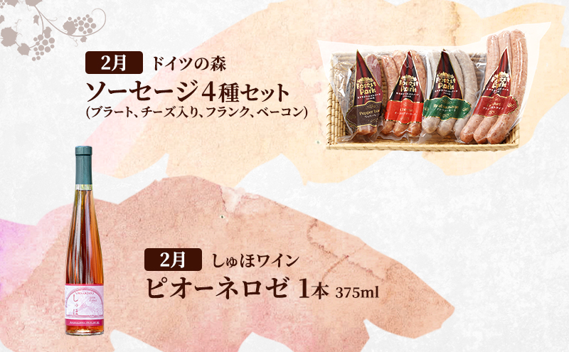 定期便 2026年 先行予約 ドイツの森の人気商品と是里ワイナリーのワイン 欲張り 2回コース ソーセージ 加工品 ワイン ピオーネ 清水白桃