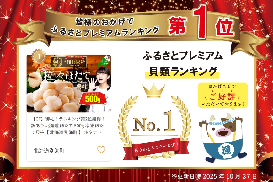 【CF】御礼!ランキング第1位獲得!訳あり 北海道 ほたて 500g 冷凍 ほたて貝柱【 北海道 別海町 】 ホタテ 帆立 ホタテ貝柱 注目 オススメ