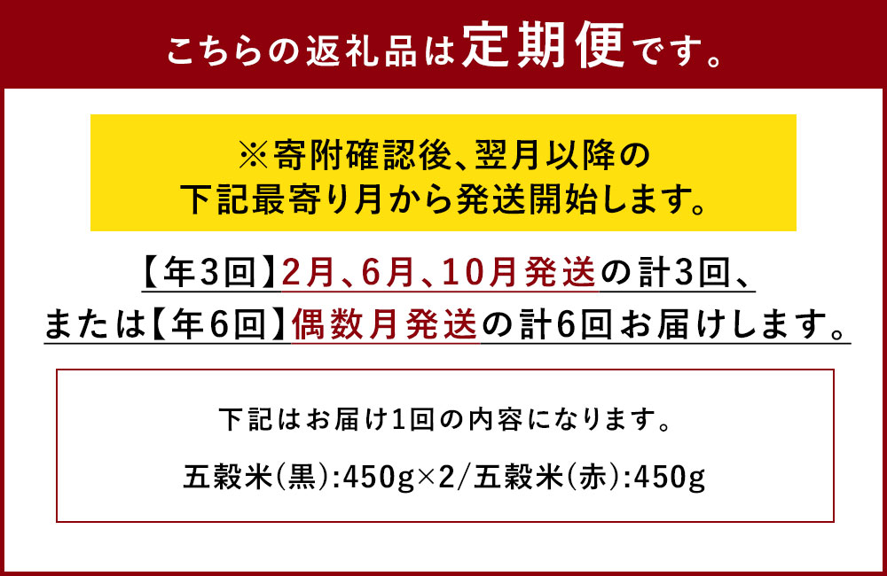 - 【ふるさと納税】予約 < 選べる 定期便 > 五穀米 (黒×2、赤×1) 3袋セット 【年3回 ( 2月 / 6月 / 10月 発送)】 または 【年6回(偶数月発送)】 合計1350g【箱入り】 または 【ご自宅用】 450g×3 とよはら農園 2種セット 熊本県産 国産 相良村産 箱入り 送料無料