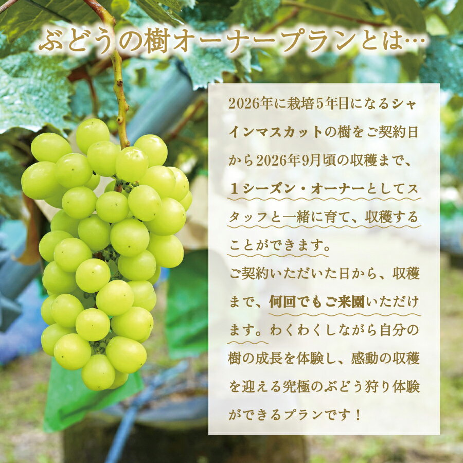 - 【ふるさと納税】 シャインマスカット ぶどうの樹 オーナー制度 1シーズン オーナープラン 【 2026年9月頃収穫 】 期間限定 栽培 収穫 体験 契約 ぶどう狩り 果物 フルーツ 5房収穫 2022年植付け