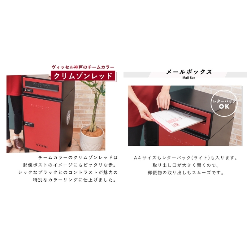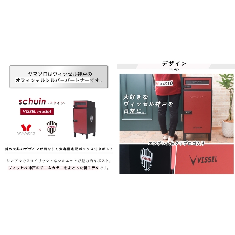 - ポスト 宅配ボックス付きポスト schuin スクイン VISSEL モデル ゼロリターンキー 置き型 大容量 郵便受け 置き配 宅配 ボックス 宅配ボックス ダイヤル錠 ヴィッセル神戸 インテリア 家具 エクステリア 外構 屋外 おしゃれ 兵庫 兵庫県 小野市