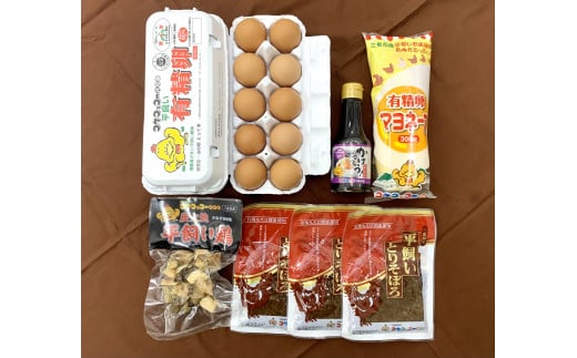 - JK‐01 たまご屋さんの ギフトセット (平飼い有精卵10個入×2・有精卵マヨネーズ(300g)1本・かけたろう(150ml)1本・炭火焼平飼い鶏(100g)1個・平飼いとりそぼろ(100g)×3袋)
