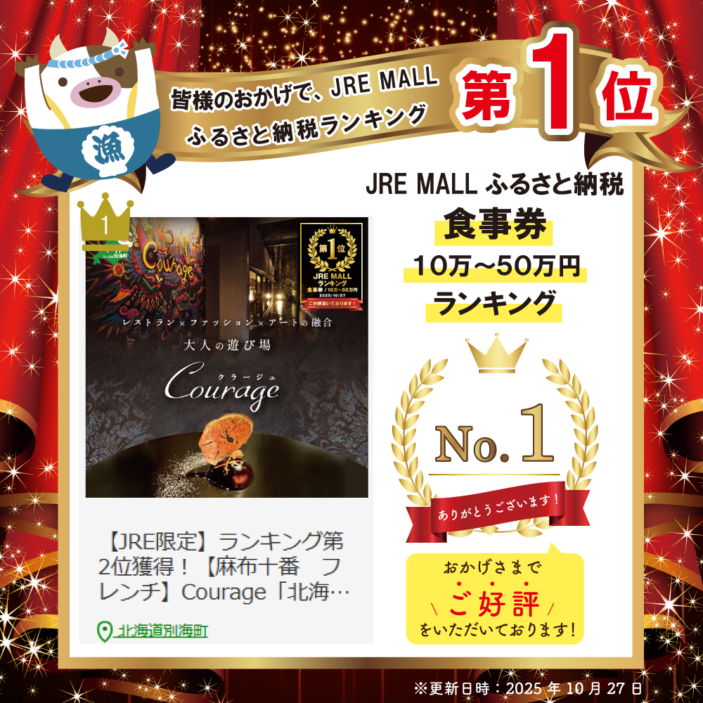 - 【JRE限定】御礼!ランキング第1位獲得!【麻布十番 フレンチ】Courage「北海道別海町×クラージュ特別ディナーコース」お食事券2名様【CC0000008】(ふるさと納税 レストラン 東京 コース料理)