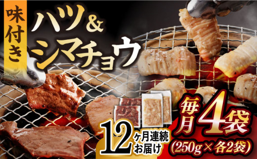 【全12回定期便】【塩だれ】九州産和牛 ホルモン2種 計1kg( ハツ 250g×2袋・ シマチョウ 250g×2袋) 長与町/岩永ホルモン [EAX137] ホルモン焼き 国産 牛肉 ホルモン ミックス 小分け 味付き 冷凍 焼肉 焼き肉 和牛 塩 しお 牛 定期便 ていきびん 定期