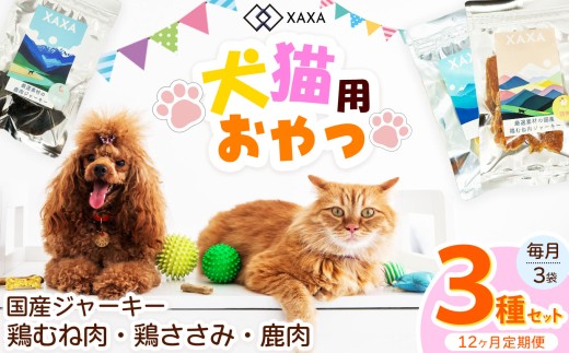 国産鶏むね肉・鶏ささみ・鹿肉 3種ジャーキー定期便(12ヶ月・毎月3袋) | ジャーキー ジビエ 鹿肉 鶏肉 鶏胸肉 ささみ 犬 猫 満足 ペット 動物 愛犬 ご褒美 信州 ふるさと納税 長野県 松本市