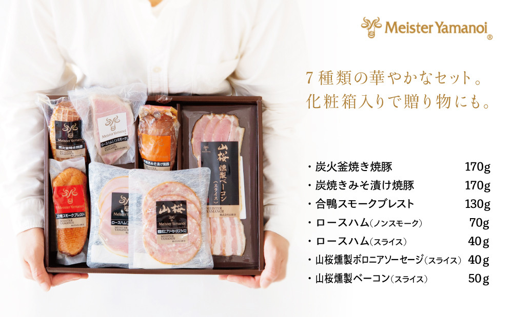 - 【お歳暮ギフト】マイスター山野井 炭火釜焼き焼豚と合鴨スモークの詰め合わせ(7種) チャーシュー ハム 焼き豚 ベーコン ロースハム 合鴨 みそ漬け オードブル パーティー 惣菜 おかず 燻製 山野井 おせち パーティー 手土産 ギフト 贈り物 贈答用 冷蔵 南さつま市 お歳暮 のし対応 熨斗