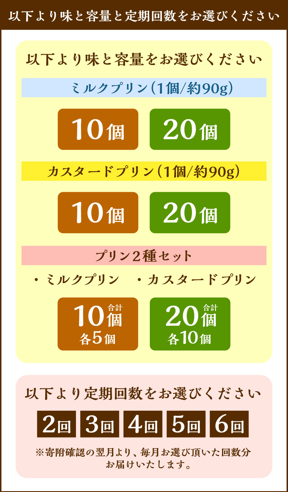 【ふるさと納税】<選べる味・容量・定期便>プリン ミルクプリン / カスタードプリン / 2種セット 1回あたり計約900g(約90g×10個) / 計約1.8kg(約90g×20個) 1ヶ月毎 2~6回 スイーツ デザート 洋菓子 お菓子 おやつ 牛乳 生クリーム 卵 冷凍 北海道産 国産 送料無料