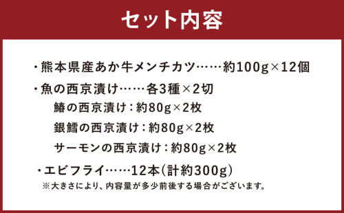 磯鷸之庄 熊本県産 あか牛メンチカツ 計約1.2kg (約100g×12個入) ・ 魚の西京漬け 計6切 (3種×各2切入) ・ エビフライ (12本入) のギフトセット あか牛 メンチカツ ミンチカツ 西京漬け 西京漬 漬け えびフライ 海老フライ 揚げ物 冷凍