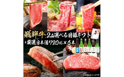 - 9-6 飛騨牛 選べる目録ギフト + 厳選日本酒720ml×6本【岐阜県 可児市 酒 日本酒 飲料 地酒 アルコール 手作り ギフト プレゼント お祝い 目録 肉 牛肉 】