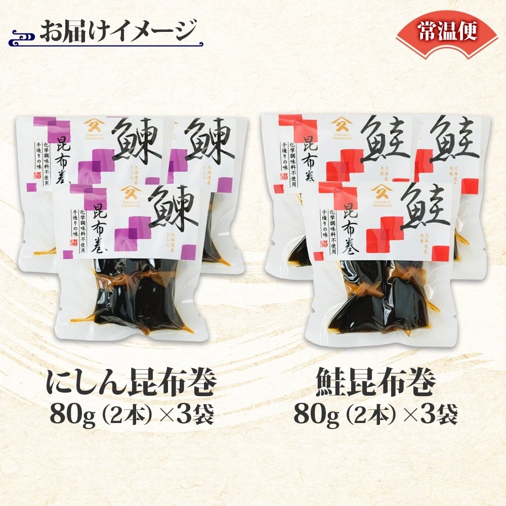 - 昆布巻き 2種セット にしん さけ 各3袋 計6袋 鮭 サケ シャケ ニシン 鰊 昆布 佃煮 昆布巻 煮物 国産 惣菜 おかず 肴 人気 和食 ギフト 送料無料 常温 タカハシ食品 北海道 函館市_HD141-050