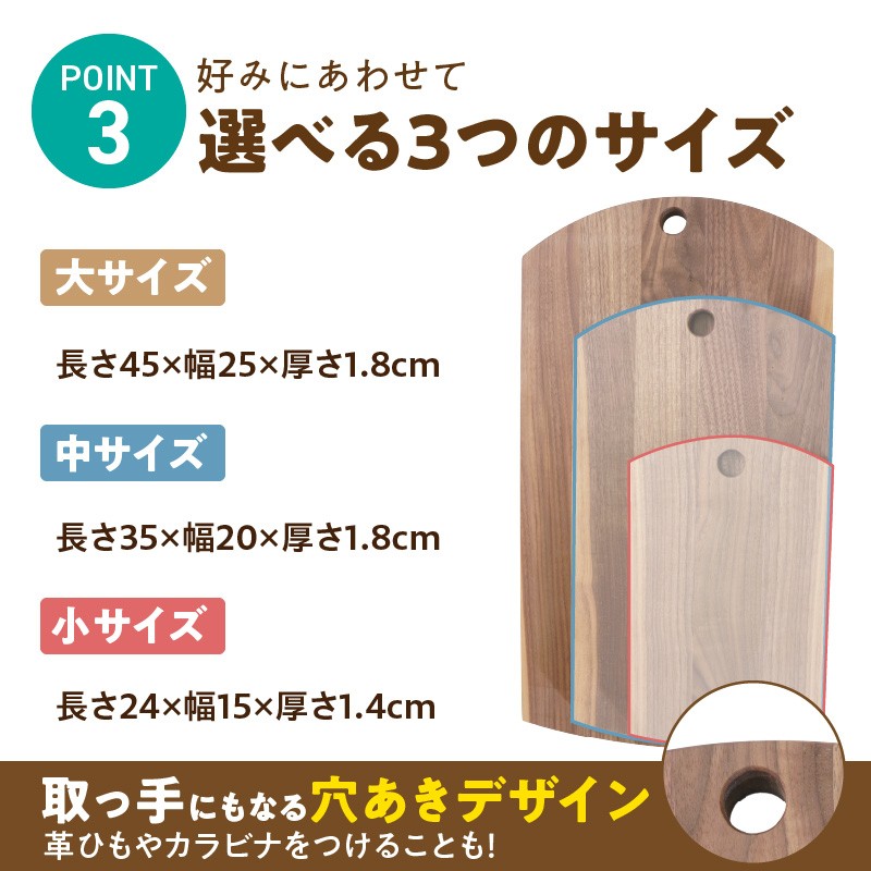 - 3つのサイズから選べる カッティングボード (樹種: ウォールナット)_カッティング ボード 1枚 樹種 ウォールナット 選べる サイズ 小 中 大 穴あきデザイン 無垢材 包丁 ダメージ 少ない 切るたび 心地よい音 まな板 お皿 キャンプ用 自然系植物性塗料 衛生的 お取り寄せ 福岡県 久留米市 送料無料_Qc167-1-sku