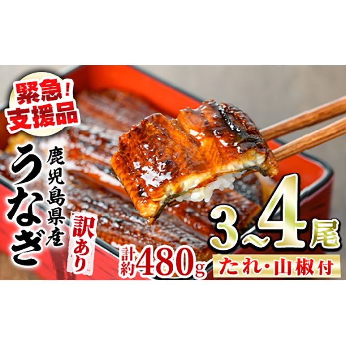 - 【0154316a】【緊急支援品】<訳あり>鰻の蒲焼き(無頭)(3~4尾・計約480g・タレ、山椒付) うなぎ ウナギ 鰻 国産 蒲焼 蒲焼き たれ 鹿児島 ふるさと 人気 支援【アクアおおすみ】