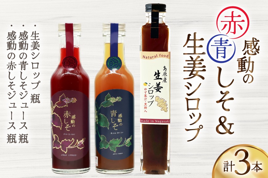 - AJ310 感動の赤しそジュース 瓶 200ml 感動の青しそジュース 瓶 200ml 生姜シロップ 瓶 250ml 飲み比べセット [ しそジュース 紫蘇ジュース 赤しそ 青しそ 長崎県 島原市 ]