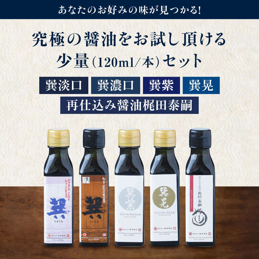 【ふるさと納税】醤油 お試しセット(巽淡口 巽濃口 紫 晃 再仕込み醤油梶田泰嗣)120ml×5本セット ミニボトル 本醸造 天然醸造 丸大豆 だし醤油 さいしこみしょうゆ 調味料 醤油 しょうゆ セット 食べ比べ 国産 おすすめ 人気 愛媛県大洲市/株式会社梶田商店[AGBB046]
