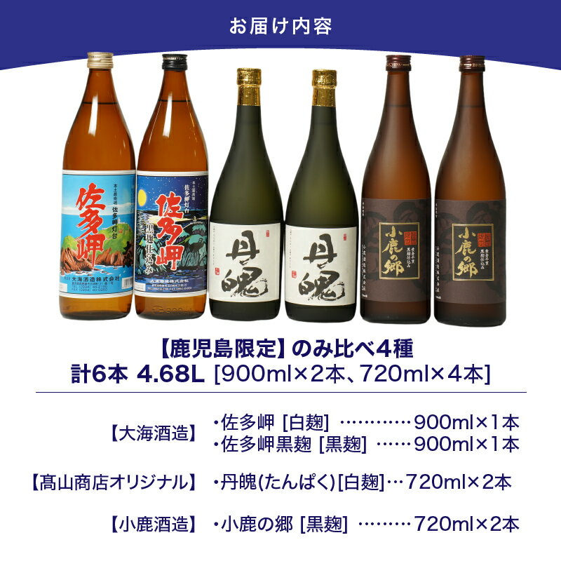 【ふるさと納税】【超特急便】【お急ぎ便】鹿児島限定 焼酎 のみ比べ 4種 計6本 4.68L(900ml×2本 720ml×4本)佐多岬 佐多岬黒麹 丹魄 小鹿の郷 限定焼酎 芋焼酎 芋 いも 焼酎 お酒 地酒 鹿児島 飲み比べ 高山商店 鹿児島 鹿屋市 おすすめ ランキング プレゼント ギフト
