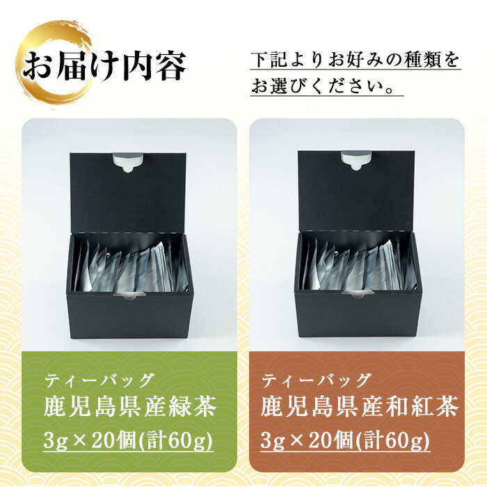 【ふるさと納税】<種類が選べる!>ティーバッグ《緑茶 / 和紅茶》(3g×20個) 鹿児島 鹿児島県産 お茶 茶 緑茶 紅茶 和紅茶 ティーバッグ 個包装 お手軽 ギフト プレゼント 贈り物 常温 【米丸製茶】