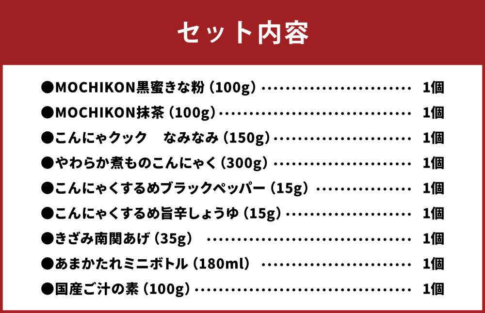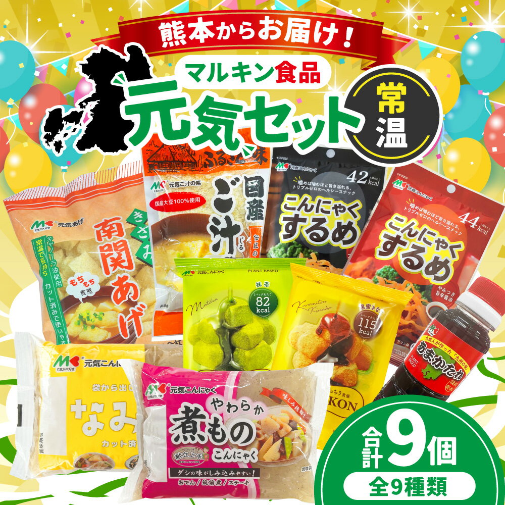 - 【ふるさと納税】熊本からお届け!マルキン食品元気セット【常温】 9種セット MOCHIKON(2種)・こんにゃクック・煮ものこんにゃく・こんにゃくするめ(2種)・きざみ南関あげ・あまかたれ・ご汁の素 コンニャク 蒟蒻 スイーツ スナック タレ 詰め合わせ 熊本県 送料無料