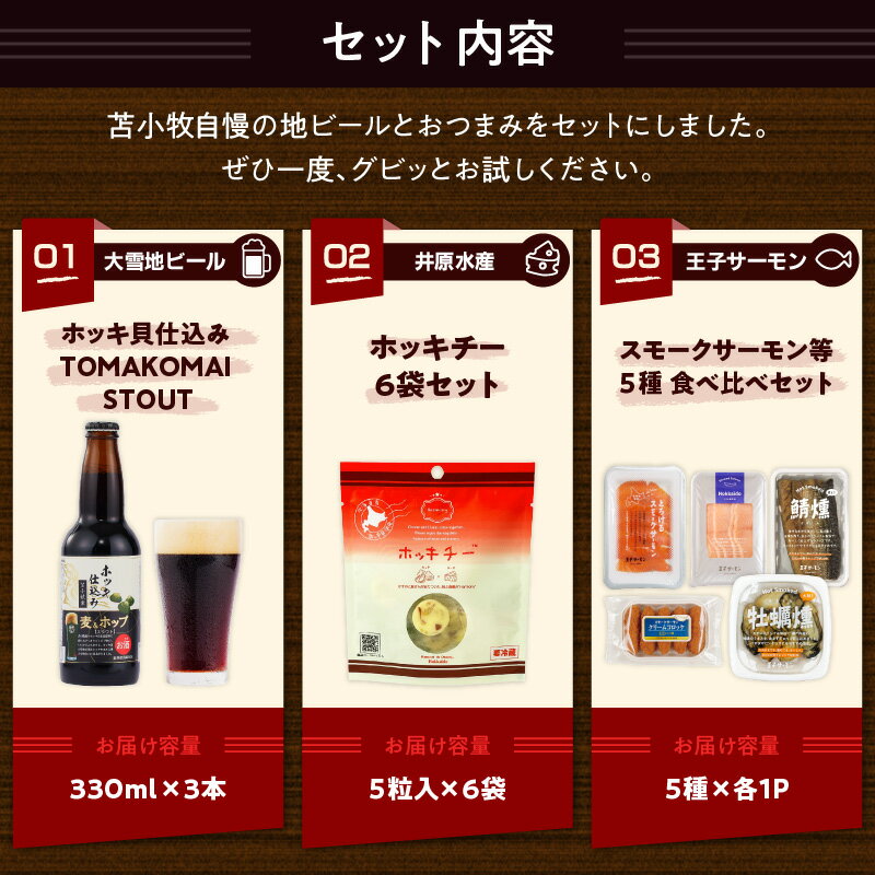 - 【ふるさと納税】 とまこまい のんべえ セット 酒 アルコール ビール 地ビール ホッキ貝 発泡酒 大雪地ビール ホッキチー 北寄貝 チーズ おつまみ 燻製 魚 サーモン秋鮭 スモーク 牡蠣 クリーム コロッケ 鯖 鮭 北海道 苫小牧市 おすすめ ランキング プレゼント ギフト