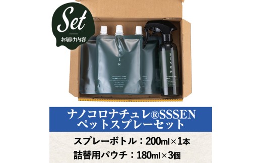 - 【令和7年お歳暮対応】温泉水で作った ペット用 消臭スプレー 「ナノコロナチュレSSSEN」ペットスプレー (ボトル200ml×1本、詰替用パウチ180ml×3個) ノンアル 犬、猫 トイレ 防災 災害 介護 衛生【SA-325H】