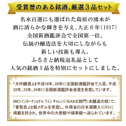 CA037 山崎本店酒造場 島原銘酒 3種セット 計1.94L [ 大吟醸 日本酒 焼酎 まが玉純米大吟醸 純米大吟醸 平成新山普賢岳 長崎県 島原市 ]