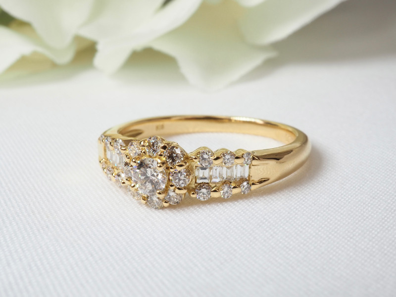 - < 甲府ジュエリー >K18YG 0.50ctバゲット&ラウンドフラワーダイヤモンドリング9201 【サイズ:8号~18号 ※0.5号刻み】