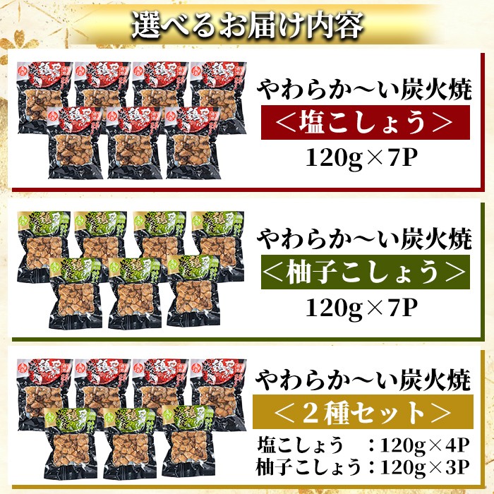 - A0-325 選べる鶏の炭火焼(120g×7P)合計840g《塩こしょう、柚子こしょう、2種セット》【ワタセ食鳥】霧島市 国産 鹿児島県産 鶏肉 鳥肉 炭火焼き 炭火焼き鳥 炭火焼鶏 真空パック おつまみ 惣菜 食べ比べ 塩胡椒味 柚子こしょう 惣菜 温めるだけ