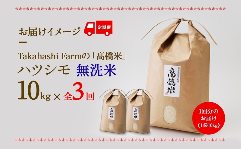 [№5568-0423]全3回お届け定期便 岐阜県 揖斐川町産 ハツシモ「高橋米」無洗米 10kg×1袋 お米 精米 白米 ごはん 米 ご飯 はつしも ブランド米 大粒 炊飯 冷めても美味しい お弁当 冷凍保存 主食 ふっくら お取り寄せ お取り寄せ 送料無料 揖斐川町