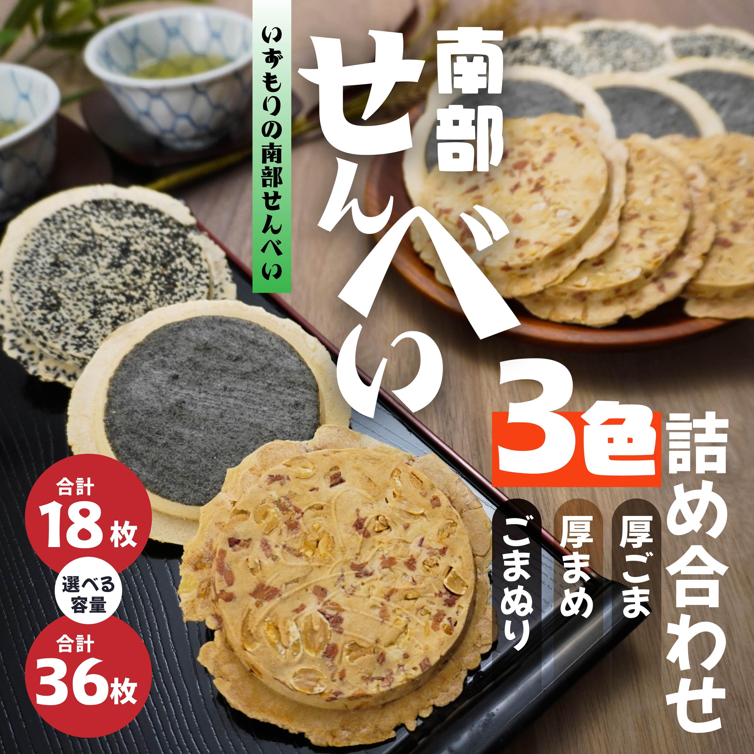 - 【ふるさと納税】【いずもり】南部せんべい 3色詰め合わせ <厚ごま、厚まめ、ごまぬり> 選べる容量 1袋(18枚) or 2袋(36枚) 青森県 八戸市