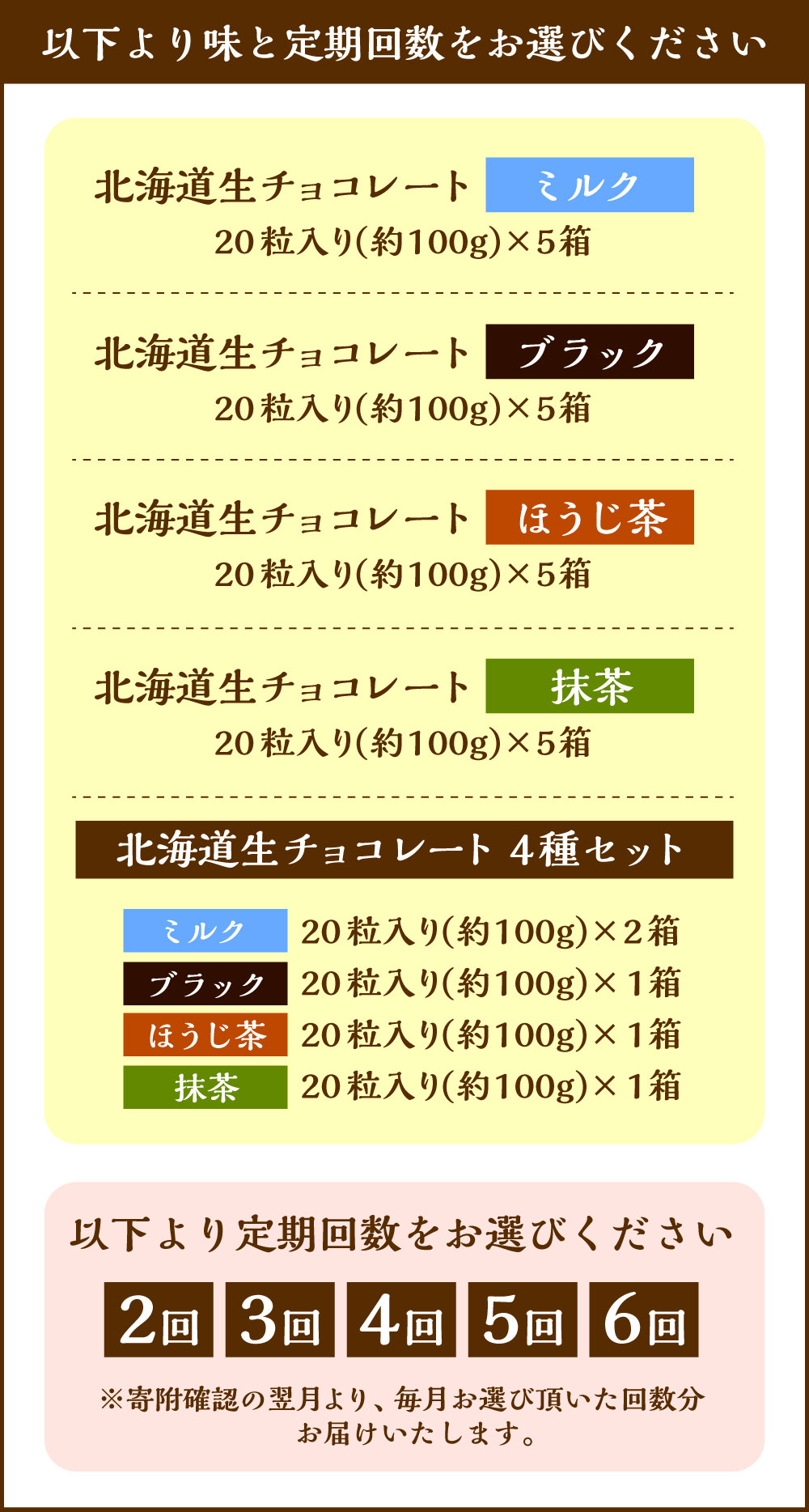 【ふるさと納税】<選べる味・定期便>《冷凍》北海道生チョコレート ミルク / ブラック / ほうじ茶 / 抹茶 / 4種セット 1ヶ月毎 2回~6回 1回あたり計約500g(約100g×5箱) 合計100粒(1箱20粒入り) チョコレート チョコ スイーツ お菓子 デザート おやつ 国産 送料無料