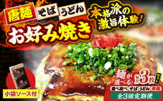 【全3回定期便】【冷凍】広島風お好み焼き(3種3枚セット) お好み焼 冷凍 ソース 広島焼 お取り寄せ そば うどん 唐麺 辛麺 広島 ソース味 昼食 お昼ごはん 夜食 おやつ 軽食 夜ごはん 晩ごはん 仕送り ストック 買い置き レンジ 温めるだけ 簡単調理 時短 B級グルメ ご当地 広島の味 惣菜 おかず 麺類 ソウルフード 広島 三次市/お好み焼き ナベちゃん [APBG010]