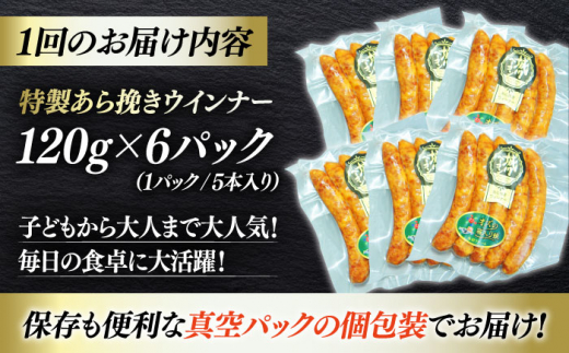 ウインナー【全6回定期便】 特製ウインナー(5本入り)×6袋 合計720g ブランドポーク『オズの箱入り娘』使用!にく 肉 お肉 豚肉 ぶたにく ベーコン ソーセージ ウィンナー 焼肉 バーベキュー おかず おつまみ おすすめ 人気 お取り寄せ 送料無料 贈答 ギフト 料理 朝食 昼食 夕食 お弁当 食卓 セット 小分け 定期便 愛媛県大洲市/株式会社オズメッセ [AGAZ077]
