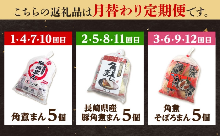 - 【月替わり12回定期便】角煮まん5個&長崎県産豚角煮まん5個&角煮そぼろまん5個 五島市/角煮家こじま [PGX083]