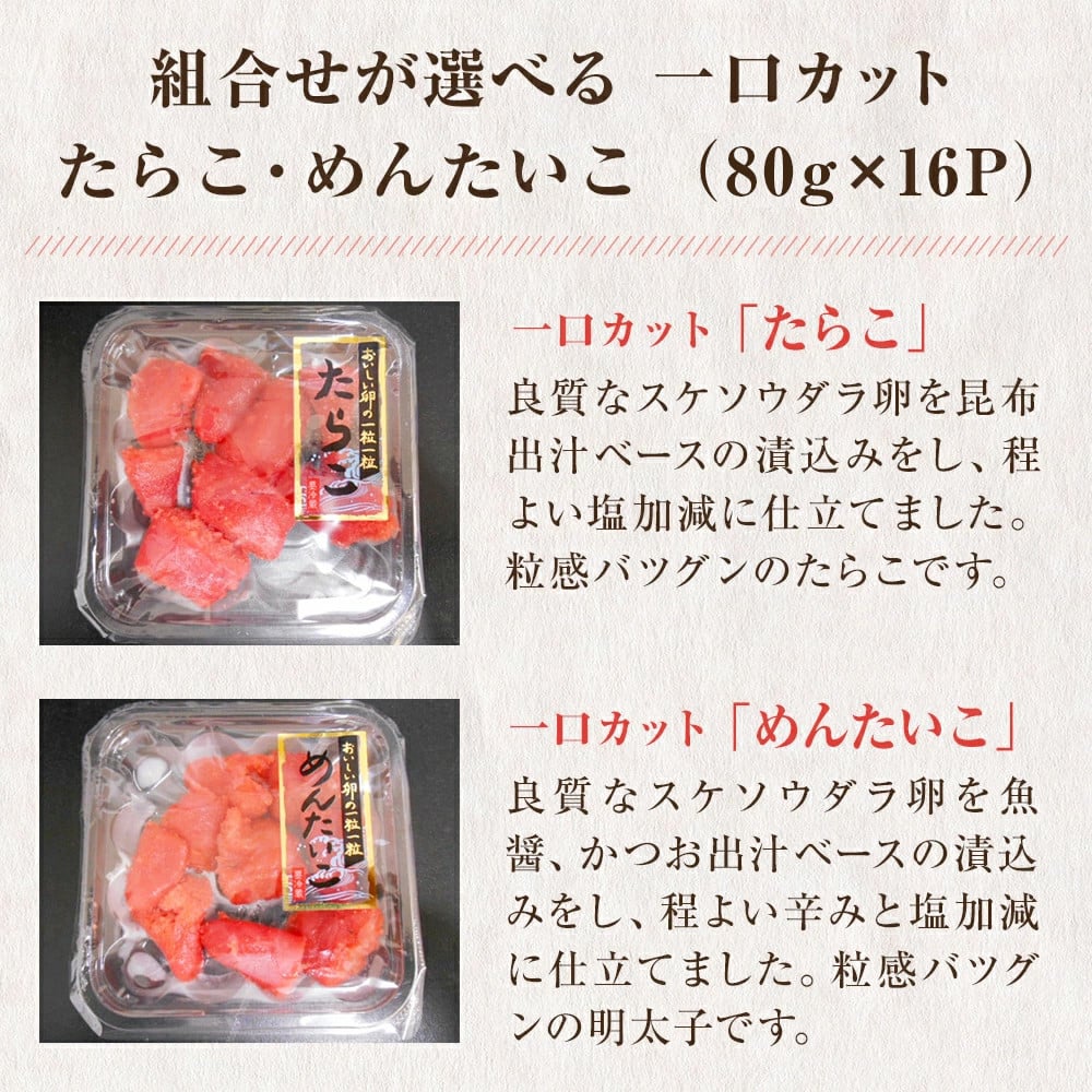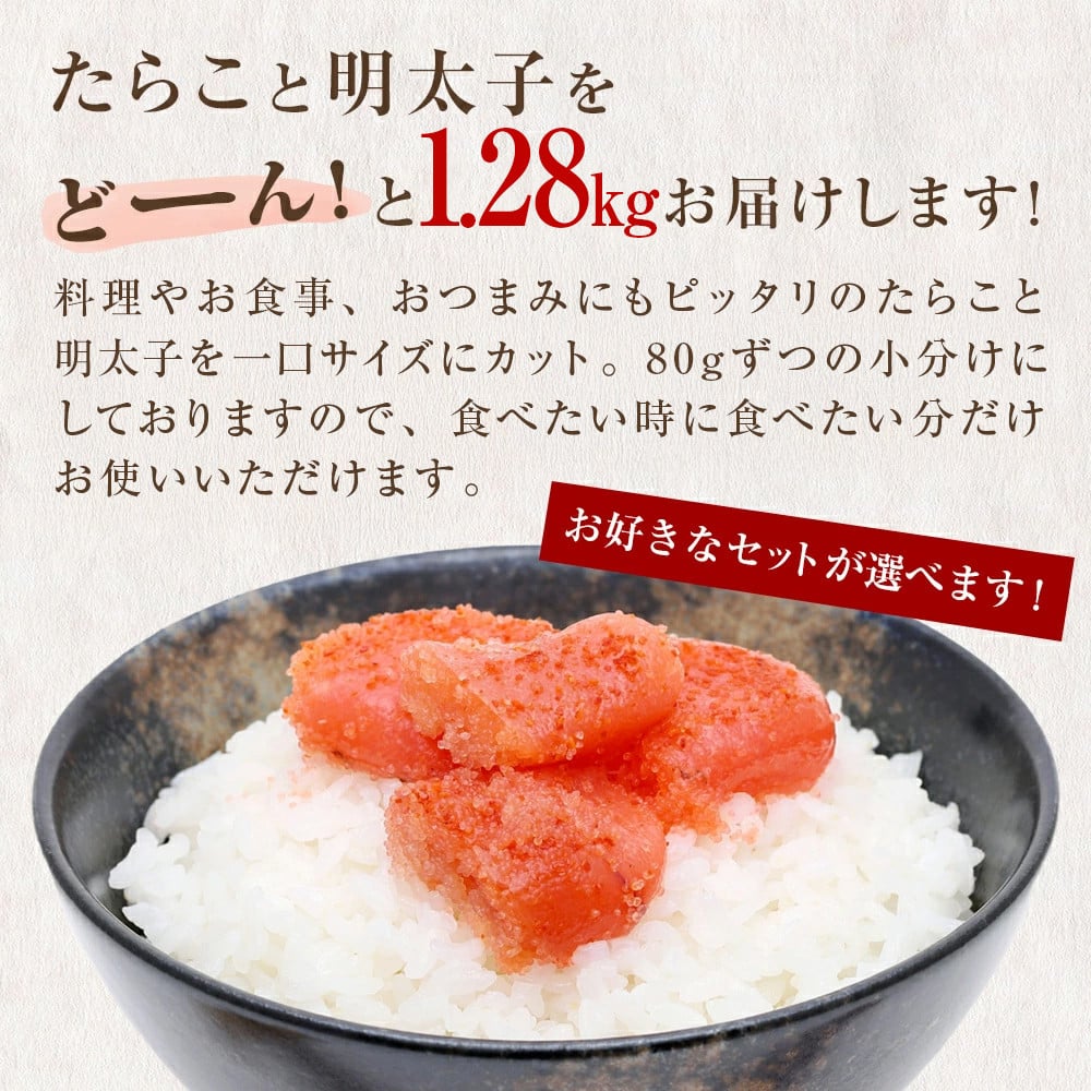 - 一口カット たらこ 明太子 合計 1.28kg (80g×16P) <組合せが選べる> 冷凍 タラコ めんたいこ 切り子 食べ比べ 切れ子 食べ切り 小分け ひとくちカット 切子 鱈子 メンタイコ おつまみ 家庭用 宮城県 石巻市 おにぎり 魚介類 ご飯のお供 海鮮 海産物 宮城 石巻 ふるさと納税 13000円