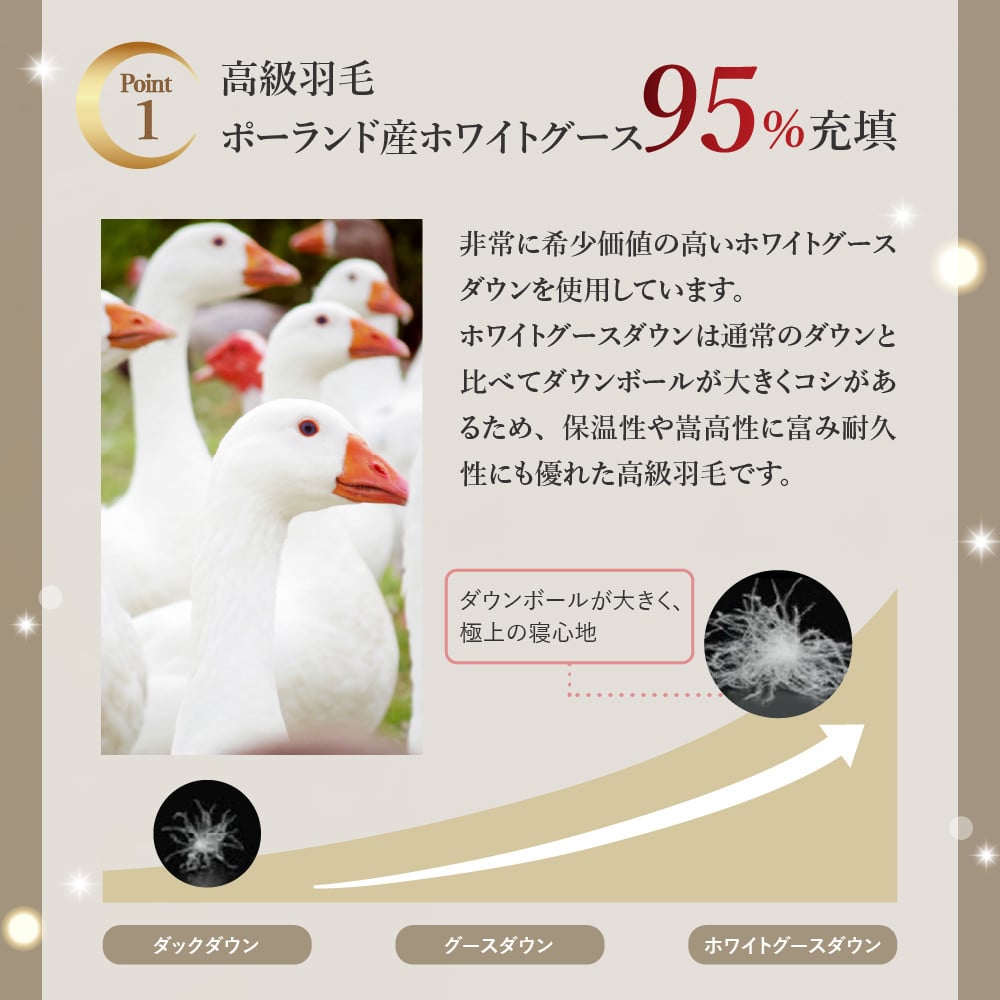 - 羽毛移動防止特殊構造 ポーランド産ホワイトグースダウン95% 羽毛増量 高級掛け布団 440dp ダブル カラーが選べる ピンク ブルー
