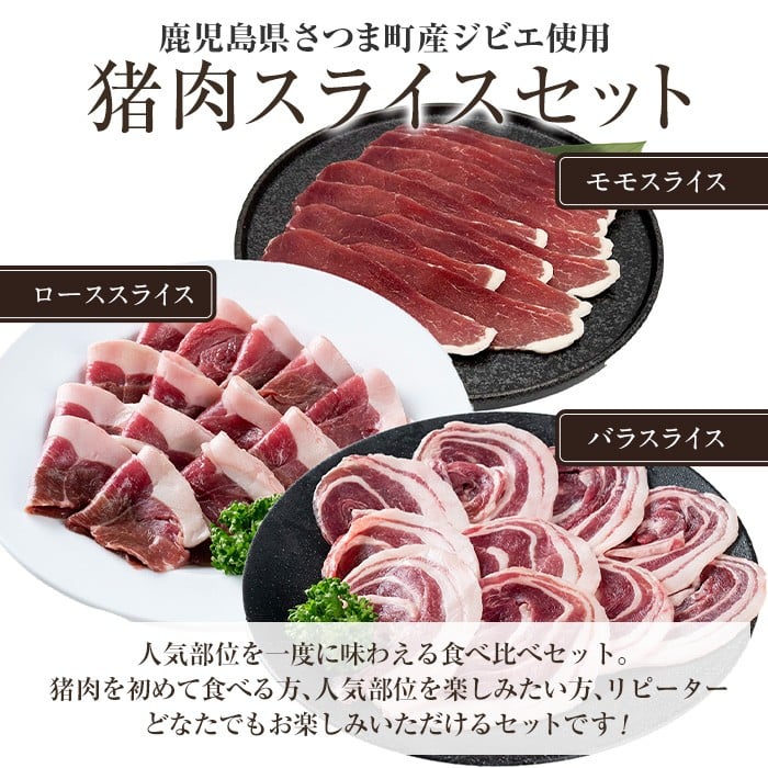 s759 〈鹿児島県さつま町産ジビエ使用〉猪肉スライス3種セット《ロース/バラ/モモ》(合計約600g・約200g×各1P) 国産 鹿児島県 猪肉 イノシシ ジビエ 肉 スライス肉 ロース バラ モモ 焼肉 ぼたん鍋 食べ比べ 詰合せ 冷凍 【さつまのジビエファクトリー】